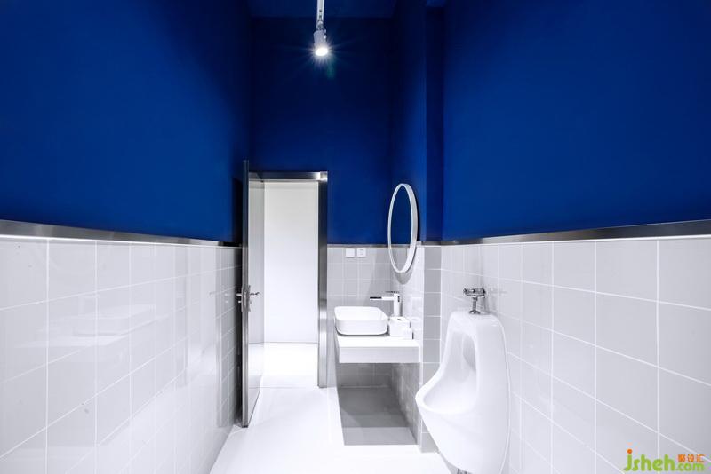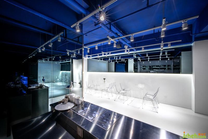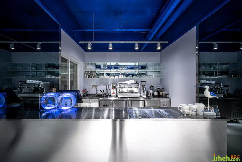 因?yàn)闃I(yè)主確定咖啡館名字叫“深?!?,所以設(shè)計(jì)師花了心思去思考到底“深?!笔鞘裁?。不同于常規(guī)的思考和正常做設(shè)計(jì)時(shí)搜索參考圖片的是,往往這樣的設(shè)計(jì)都是帶有藍(lán)色的空間,但“深?!边@個(gè)名稱所帶來的概念思考卻是,為什么深海是藍(lán)色的?當(dāng)透過這層思考方式去搜索就會(huì)發(fā)現(xiàn),海水之所以是藍(lán)色,是因?yàn)樘炜帐撬{(lán)色的(原理就不多說了),水體(空間)是透明的,所以深海的藍(lán)色是光和材料本身所產(chǎn)生的而非通過“設(shè)計(jì)”創(chuàng)造的。帶著這樣的邏輯,整個(gè)空間的設(shè)計(jì)就很明確了,拆除原有的吊頂,用涂料做成藍(lán)色的“天空”;下面的空間則使用帶有反射性/透明性的材料——鏡面、金屬、亞克力、塑料等,通過這種曖昧的委婉的,而非簡(jiǎn)單粗暴的方式,讓深海的藍(lán)色充滿整個(gè)空間。