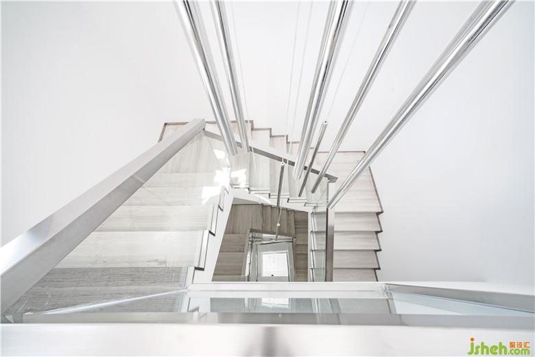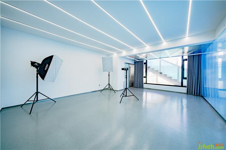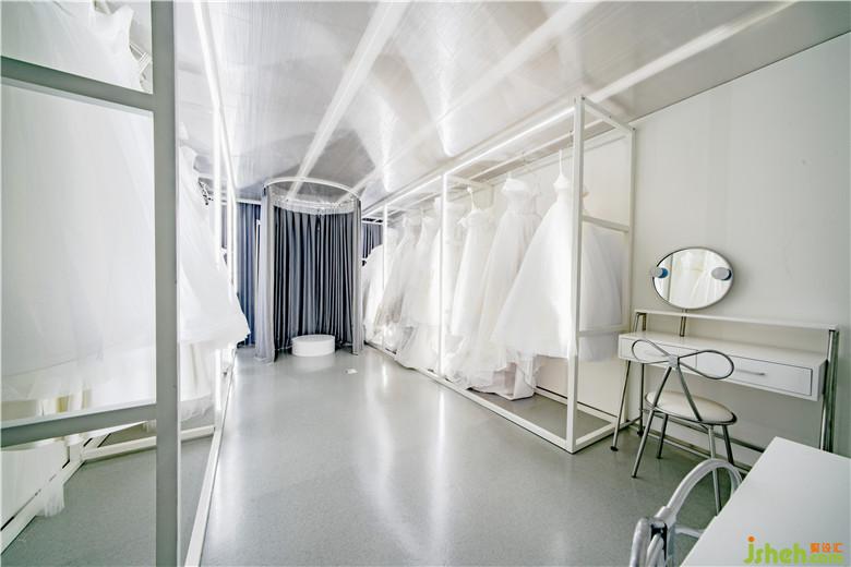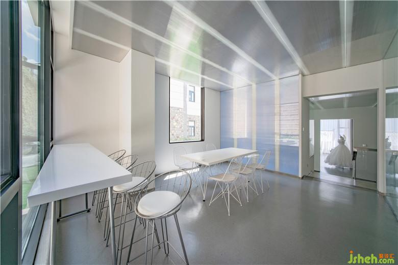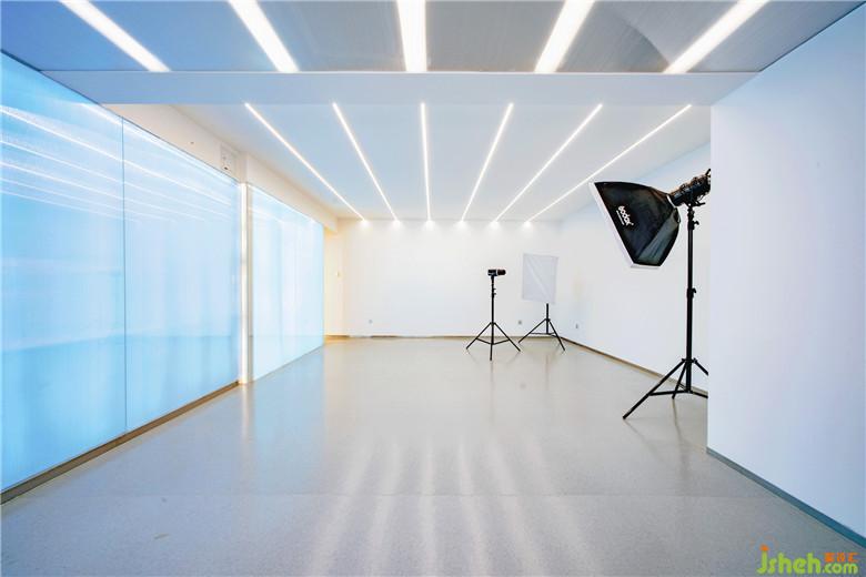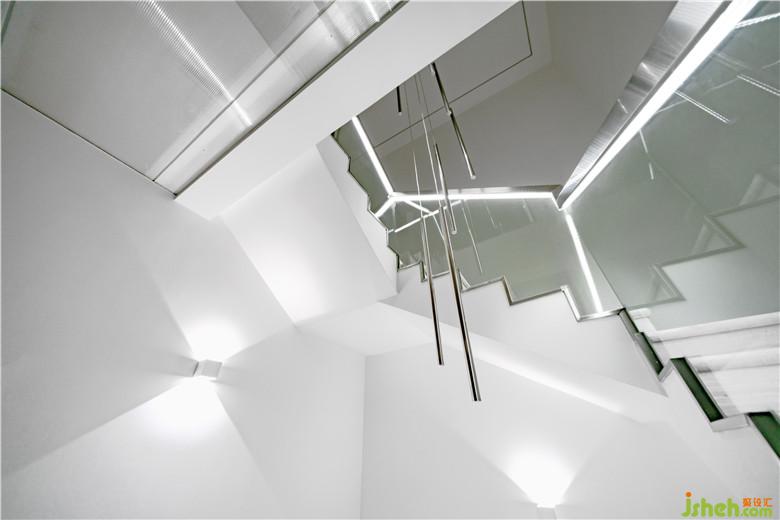 公共空間的設計通過盡可能塑造出的純凈超現(xiàn)實場景來喚醒使用者深藏心底的幻想。公共空間由白色墻面、淺灰色略帶反射的地面,以及幾近朦朧的陽光板營造出純凈、極致氛圍。作為主空間僅有的幾件家具與婚紗,仿佛博物館中的幾件展品,營造一種空靈的效果;墻體內(nèi)的燈光通過陽光板在墻面投射出粼粼波光,這些隱約的光影給主空間的純凈又添加了一絲神秘,去誘發(fā)情侶去體驗其行為活動中細微的變化。樓梯間作為整個建筑中唯一通高的空間,結合線性光的設計元素,我們利用長條筒燈進行再次設計,高高低低地在樓梯間形成一個新的燈光裝置節(jié)點,投下影影綽綽的效果。