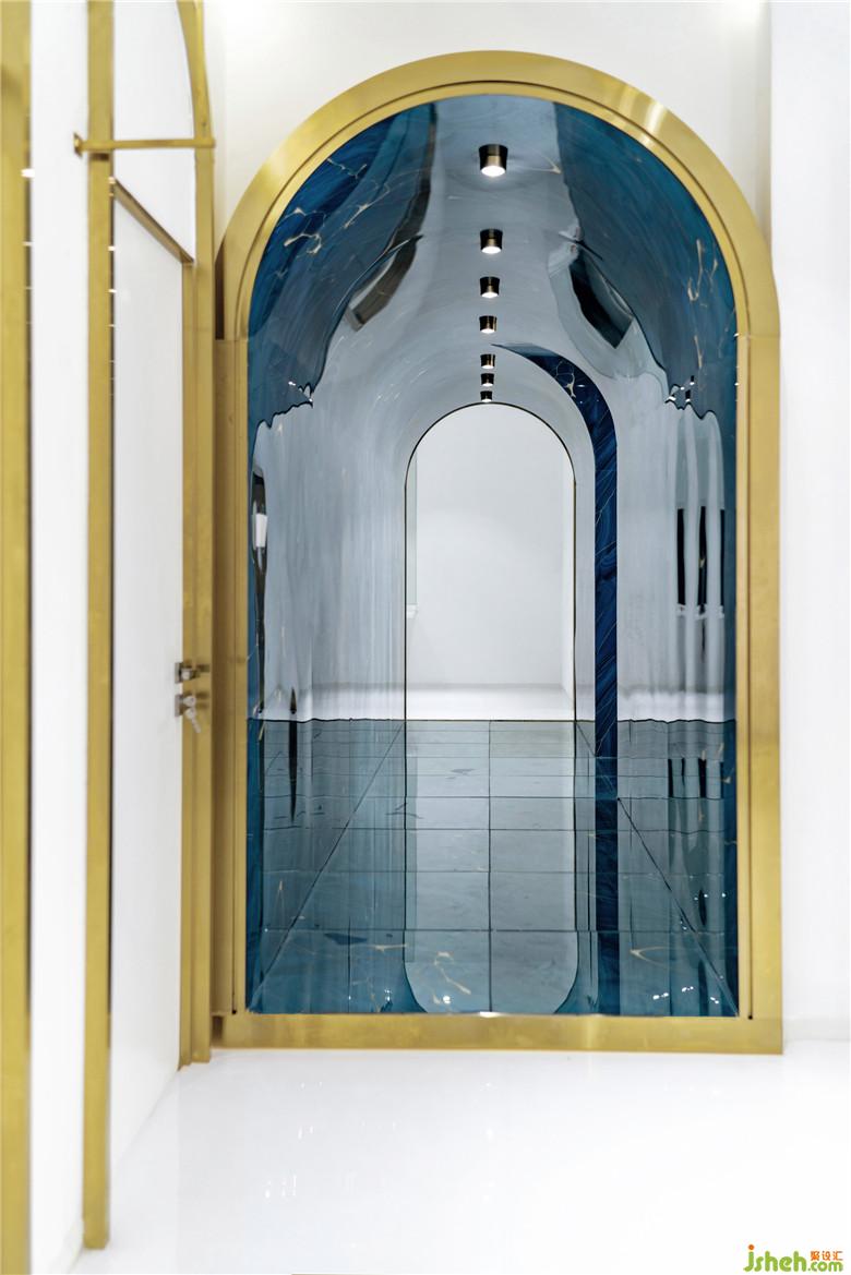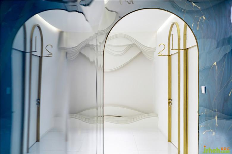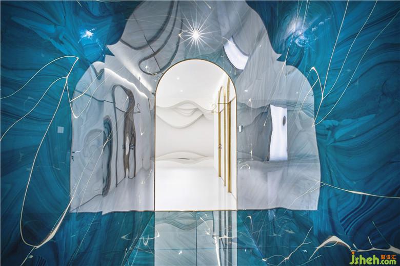 空間選材上,整體運(yùn)用白色木飾面、乳膠漆等作為空間基調(diào),仿古銅拉絲不銹鋼、水晶板、淺灰原木等作為點(diǎn)綴。“T”形通道則采用弧形拱頂,并在墻、頂、地三面上都統(tǒng)一使用藍(lán)色的水晶亞克力板來(lái)打造“深水冰窟”的沉浸式體驗(yàn),使得空間充滿(mǎn)視覺(jué)張力。二者不論在色彩還是形式上都形成鮮明對(duì)比,從而突出強(qiáng)調(diào)了“秘境”通道的獨(dú)特沖擊力。