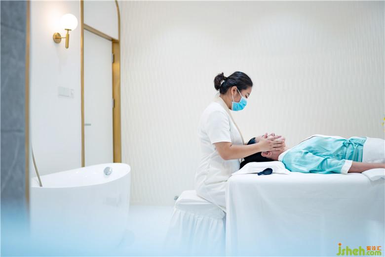 客人由入口至大堂接待區(qū),而后穿過(guò)藍(lán)色的通道開(kāi)啟她們的美麗旅程——依次先穿過(guò)通道在等候區(qū),進(jìn)行膚質(zhì)等等的檢測(cè)和美容問(wèn)題的咨詢(xún),而后穿越一次通道進(jìn)入休閑區(qū),護(hù)膚理療休憩功能一應(yīng)俱全,客人能在這里舒適地享受護(hù)理服務(wù)、交談、茶座等,寬敞的休閑區(qū)還未沙龍、講座的公共行為提供了可能性。三處空間私密性遞增,通道則是不同功能與空間畫(huà)面間的轉(zhuǎn)場(chǎng)。