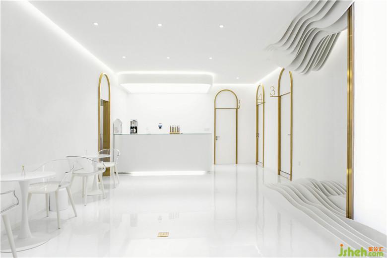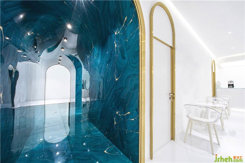 行至此間,恍如身處深水密穴,很好地豐富了客人的空間體驗感。它巧妙地減少了交通空間的占用面積,從而能留出更多的空間給公共活動,以提升空間使用的舒適度,盡管在色彩與材質上過道空間與其他空間形成了鮮明對比,但通過波浪形的雕塑對這種山水氛圍的渲染,使整個空間成為一個整體。