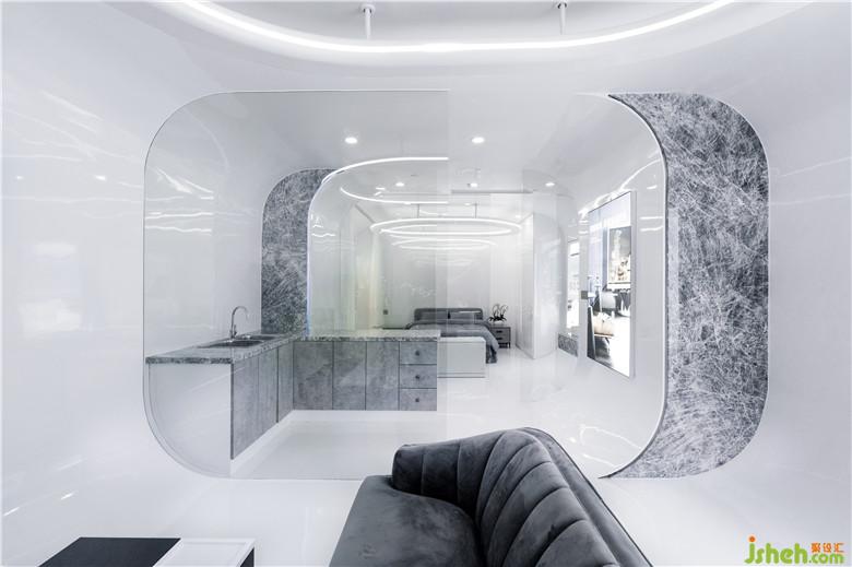 由于空間面積有限且平面本身形狀較為特殊,依照傳統(tǒng)家居體驗(yàn)館模擬真實(shí)家居環(huán)境的模式極易造成功能分布混亂且尺度失調(diào)。其次,考慮到體驗(yàn)者各自的家庭內(nèi)飾風(fēng)格、個(gè)性、審美特質(zhì)等等均存在差異性,嘗試模擬真實(shí)環(huán)境的設(shè)計(jì)反而容易適得其反,產(chǎn)生陌生疏離感。因此,布局上將單個(gè)家居場(chǎng)景與線性的體驗(yàn)流線相結(jié)合,按照私密性由弱到強(qiáng)的順序,依次從外而內(nèi)布置客廳、廚房、洗手間、臥室,使顧客得以在場(chǎng)景模塊間“穿梭”,不同場(chǎng)景中的各個(gè)產(chǎn)品的特性、優(yōu)勢(shì)及使用方法也隨之得到理性且明確的傳達(dá)。
