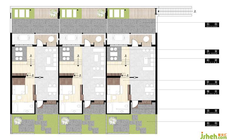 原場地由一個開間21.6m,進(jìn)深8.2m的房舍和前后兩個院落構(gòu)成,設(shè)計將原始建筑平面于東西向等分,保留原有門窗、結(jié)構(gòu)梁,形成三個相對獨立的居住單元,保證了各自的獨立私密性,運(yùn)營方面也可作分開出租。