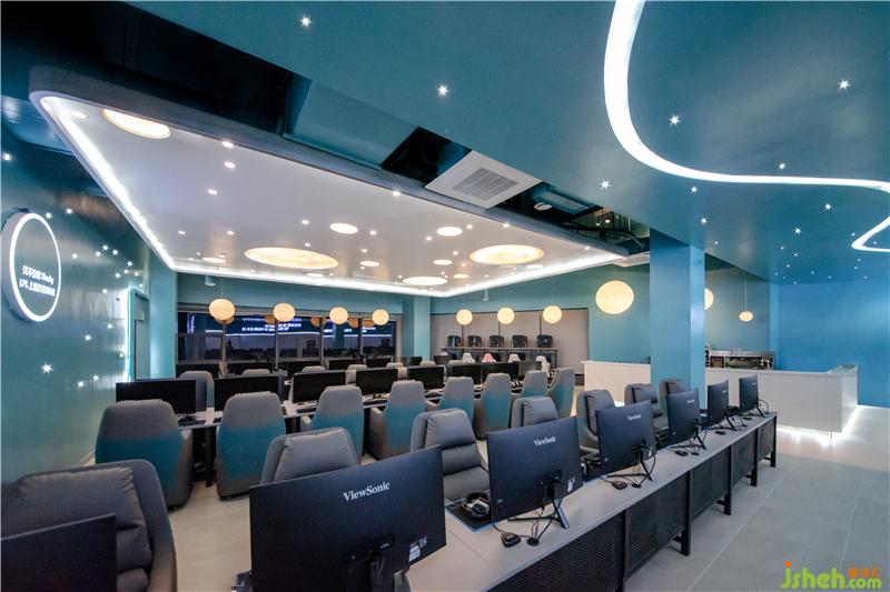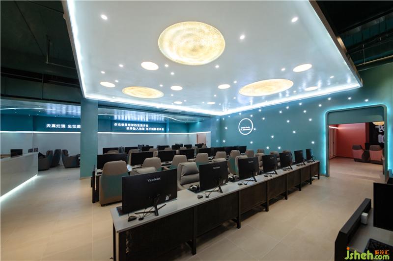 為了更好地突出網(wǎng)咖的主題概念,將吊頂作為設(shè)計(jì)的重點(diǎn)部分。吊頂采用石膏板,并結(jié)合燈珠和LED燈帶等不同燈具點(diǎn)晴視覺效果,成功統(tǒng)一了空間內(nèi)元素,奠定了室內(nèi)的整體基調(diào)。墻板藍(lán)色的底色,結(jié)合彎曲延伸的燈帶和星羅棋布的燈珠營(yíng)造出銀河太空般夢(mèng)幻的氛圍。光成為一種全新的設(shè)計(jì)語言,大大小小的圓形光源宛若小小星辰,不僅在功能上聚焦人們的視線,也體現(xiàn)出空間的明暗層次,更好的豐富了玩家的休閑娛樂體驗(yàn)。燈光在材質(zhì)表面暈展,材質(zhì)對(duì)光也有良好的映射效果,在這里,燈光似乎改變了空間,游戲玩家在虛擬世界中探索遨游,釋放自己,追逐著內(nèi)心的星辰。會(huì)所設(shè)計(jì)