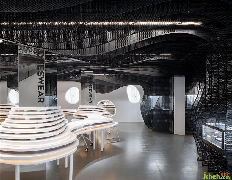 整個(gè)空間設(shè)計(jì)從展品的布置開始,因?yàn)榭紤]到業(yè)主提出要將原來(lái)店鋪的珠寶盒重新利用放置在新店中,設(shè)計(jì)師將舊珠寶盒隱匿于墻面的穿孔板中,弱化了珠寶盒龐大的體量和方正的造型。同時(shí),將珠寶盒嵌制于墻上也為中心流線型網(wǎng)紅打卡裝置節(jié)省出較大空間。墻面采用穿孔板切割成片狀曲面,并滿足一定防火等級(jí)要求。