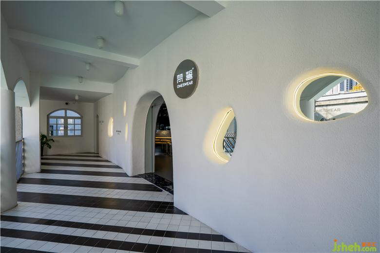 The fa?ade is painted plain white with natural stone coating, and the entry is designed to echo with the concept of caves. Several streamlined and curved windows of different shapes display the color of comforting with well-distributed illumination of the strings of lights surrounding them, making the space looks more integrated and coherent. Meanwhile, such design comes from newly-thickened walls to extrude the decoration part and will not damage the original wall.