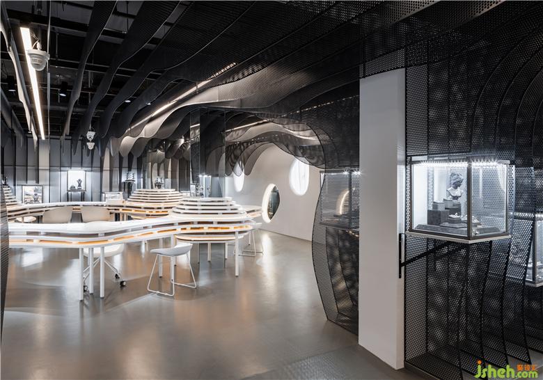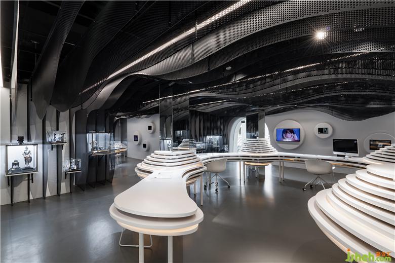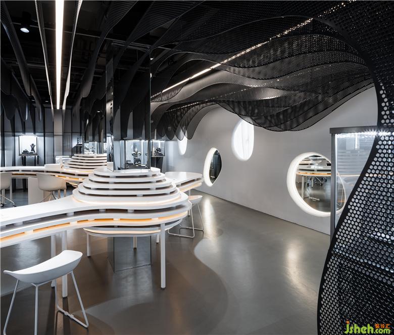 The indoor design has altered the tedious and simple spatial form to an artwork as the main exhibition area with a variety of functions such as exhibition, communication, tourism and sales, achieving unlimited forms within limited area. Moreover, various functions coordinate with the streamlines of the whole space and then also become dynamic and continuous moving lines, providing people with refreshing experience while they are shopping. As the streamlined artwork fit in with the sales, exhibition and activities, it offers the customers more continuity and variety in terms of viewing the moving lines, and it also become a poplar site for visiting among the young group. Such method of design restructures the function layout, and create a more complete and authentic space for jewelry sales, achieving a more clear and efficient streamlines and greater space visually.