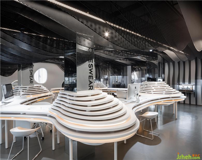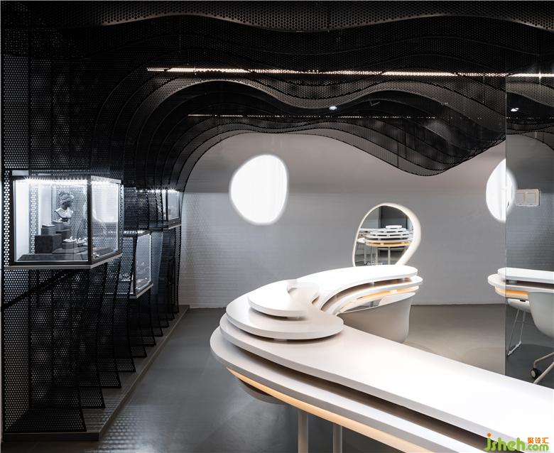 The streamlined desktop and the walls fit in with each other but also stand alone on their own. Different spaces with different functions connect all the areas altogether such as jewelry exhibition area, negotiation area, sales area and washing basin to meet all the demand in the store and convey continuity and similarity of spatial vision. In addition, the design of complex of desks and chairs is in accordance with the Ergonomics and improve the level of comfort to the maximum. On the basis of balancing functions and forms, the design enables the customers to shop smoothly yet unpredictably.