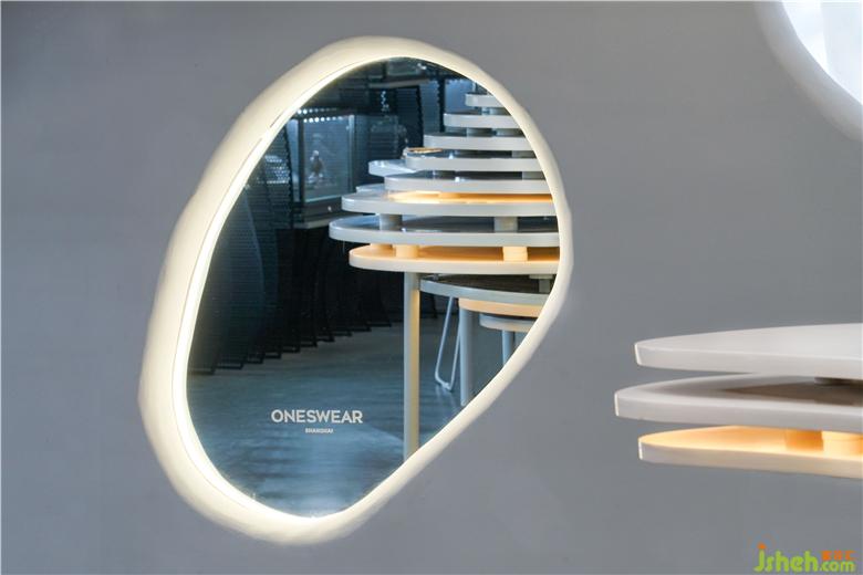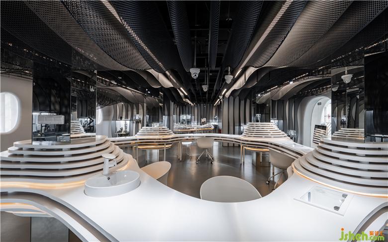 室內(nèi)部分設(shè)計(jì)改變了原本單一、基礎(chǔ)的空間形態(tài),通過打造一個(gè)藝術(shù)裝置成為空間的主展覽區(qū),并營造了展示、交流、打卡、銷售等不同空間體驗(yàn)的多樣性,達(dá)到了在有限空間內(nèi)的無限延展形態(tài),并且這些不同的功能順應(yīng)整個(gè)空間的流動線性形式也形成動態(tài)而連續(xù)的動線,讓人們在逛店的過程中體會不同的空間感受。同時(shí)這個(gè)流線型藝術(shù)裝置在適應(yīng)不同類型的銷售、展覽和活動舉辦的同時(shí),為顧客的觀看動線賦予了更多的延續(xù)性與多樣性,同時(shí)也成為當(dāng)今年輕人熱衷的網(wǎng)紅打卡點(diǎn)。通過這樣手段來塑造結(jié)構(gòu),是對功能布局的結(jié)構(gòu)重組,也使得珠寶展銷區(qū)域擁有更完整、純粹的展示面,從而獲得更清晰高效的流線與更大的空間視覺效果。