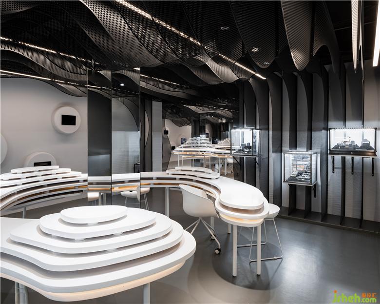 珠寶店鋪設(shè)計(jì)流線型桌面與墻面既交相呼應(yīng)又獨(dú)立分隔,在功能上對不同空間進(jìn)行定位,將珠寶展示、洽談區(qū)、銷售區(qū)、洗手池等所有功能整合串聯(lián)起來,滿足門店所有需求,傳達(dá)空間視覺連續(xù)性與統(tǒng)一性,并且桌椅的組合符合人體工程學(xué)的要求,讓體驗(yàn)舒適度達(dá)到最大值。在平衡功能和形式的基礎(chǔ)上,讓顧客感受到流暢且充滿未知感的購物體驗(yàn)。