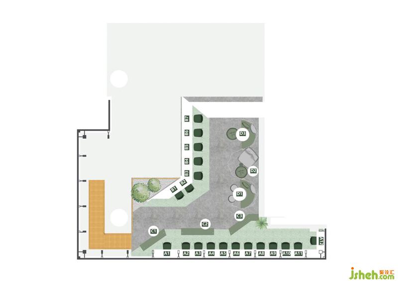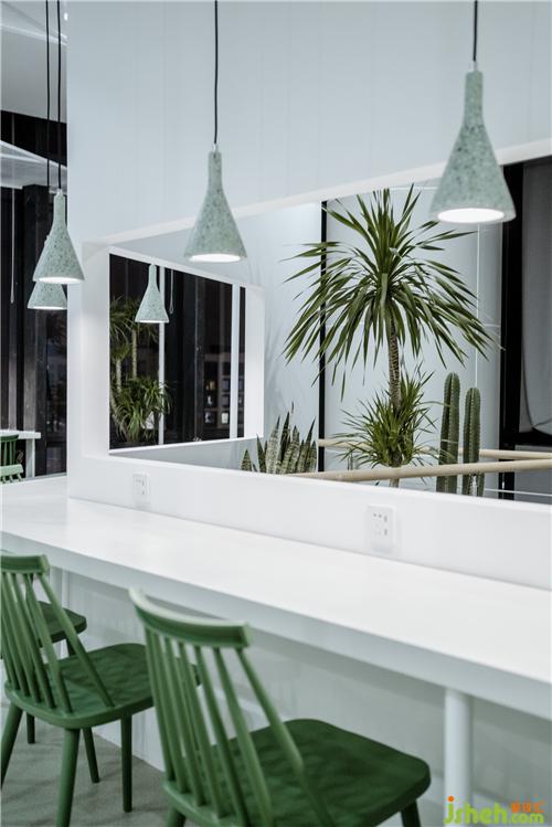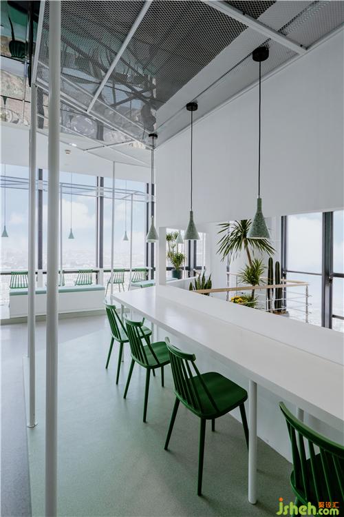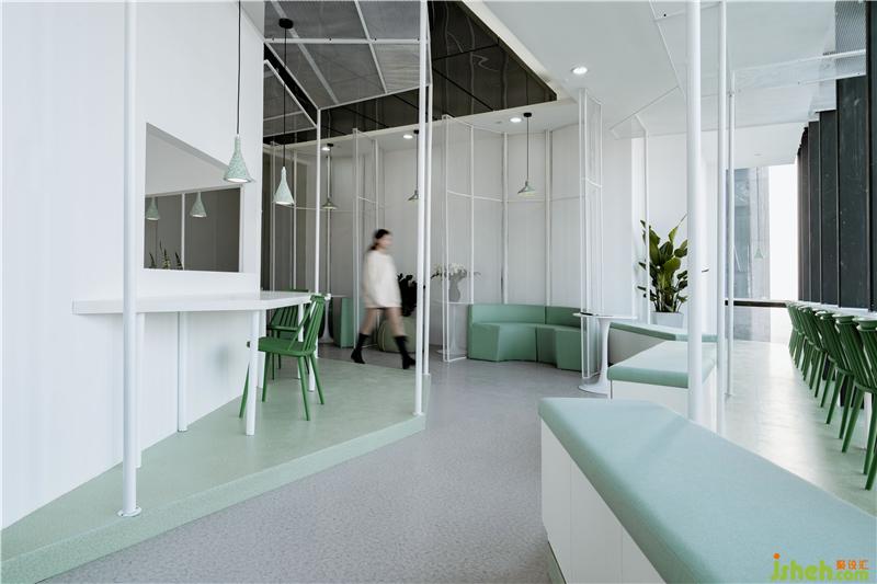 在這里,人們可以短暫逃離繁忙都市的現(xiàn)實,猶如置身于寧靜的自然花園,在緊張的工作中使身心得到放松,從而提高學習效率。精巧構(gòu)思的曲線性的工作臺與直線性的走廊空間形成對比,連續(xù)的曲線界面將辦內(nèi)部空間分割成不同的區(qū)域,使人產(chǎn)生不同的過渡體驗;鋪設(shè)在桌椅下的綠色鋪裝好似置身草地氛圍;穿插于工作臺之間的相對低矮的蕨類等小型植物既能讓客戶感知自然,功能上又可切實地改善室內(nèi)微氣候與環(huán)境,自習室裝修設(shè)計使每一個角落都能被綠色充滿;半通透式白色沖孔板圍而不合,模糊了空間的邊界,于是墻體的堅實感被消解,改變空間分割呆板的印象。純粹、自然、輕盈是整個空間遵循的主題,在喧鬧的姑蘇街景映襯下,它仿佛是靜止的,成為都市中一道亮麗的風景線。借窗外市井的生活,不同場景的引入讓每一個自習角落都不盡相同,或綠或白讓每一個客戶都有一個專屬于他自身的棲身之所。