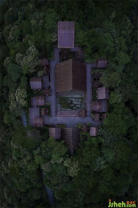 “小鎮(zhèn)”中軸上的多功能大廳造型上是小木屋的放大版,仿佛3種木屋模塊未來功能延展的一張“使用導(dǎo)則”,九江民宿設(shè)計(jì)也是“小鎮(zhèn)”中唯一引入室內(nèi)功能的空間。頂部天花木瓦斑斕下,有種道不明的儀式感。