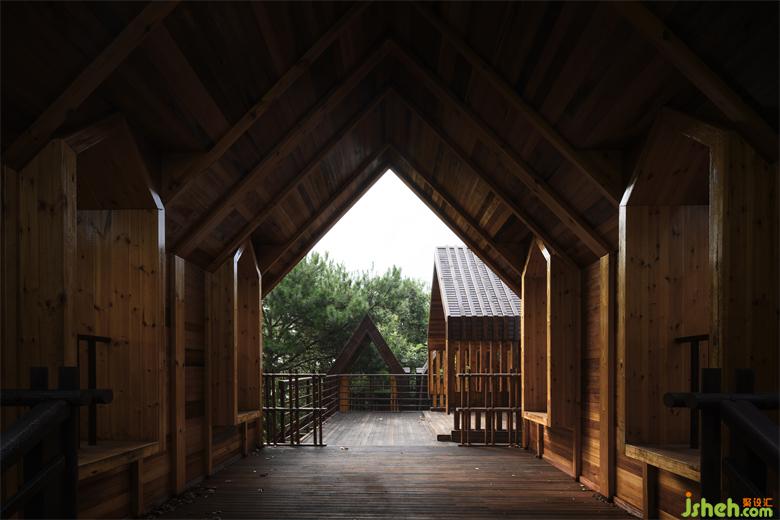 The multifunctional hall on the central axis of the "town" is an enlarged version of the small wooden cabin, like an "instruction" for the future functions of the three types of wooden cabin modules, and it is also the only space in the "town" that introduces indoor functions. The top of the ceiling is covered with shingles.