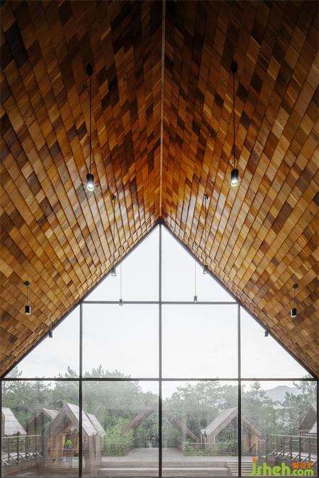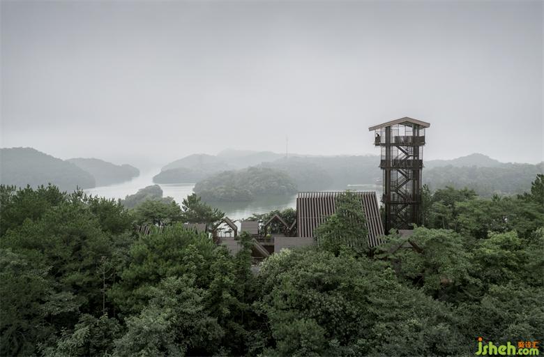 The steel structure observation tower is the highest point of the entire island, visitors can have a good view for the whole lake area when standing on the top. The fa?ade of anticorrosive wood grille designed to reduce wind resistance presents various permeability from different viewing angles: when people looking from the boats on the lake, the towers erected in the jungleis looming. At sunrise and sunset, sunlight seeps from the gaps in the grille.