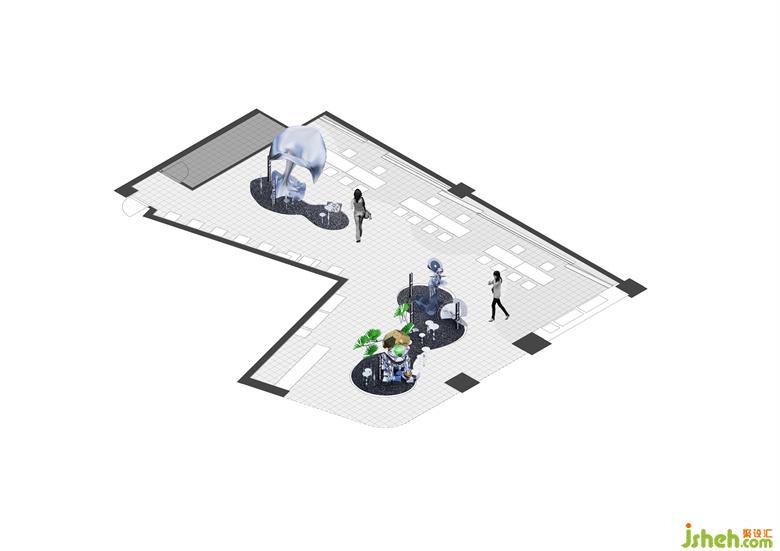 《游園驚夢》作為《牡丹亭》的知名曲目之一,其故事家喻戶曉。我們?nèi)∑鋲糁杏螆@和情人相會的古典意象,映射到空間內(nèi)的三組裝置中,將典型的傳統(tǒng)形象以現(xiàn)代手法轉(zhuǎn)譯為新的藝術(shù)形象,以未來風(fēng)格的材質(zhì)賦予傳統(tǒng)實物熟悉卻陌生的質(zhì)感,去演繹一段帶有未來氣息的經(jīng)典故事。整體布局上以三組藝術(shù)裝置為中心,突出空間主題和故事感。
