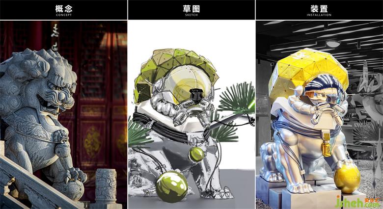 裝置頭部以拼接甲胄造型表達,面部采用電鍍工藝的鏡面反射球體,與金屬元件管、充氣囊、天線零件等富有科技感的“五官”結(jié)合;脖頸項圈改為數(shù)圈線纜,掛著品牌獨特的膠囊戒指盒,并延伸到背后的松枝上;身體則采用玻璃纖維3D打印工藝整體成型。石獅子背后的綠色松枝用LED燈管制作成鐳射激光松枝,結(jié)合連接的線纜,營造了電力光效。