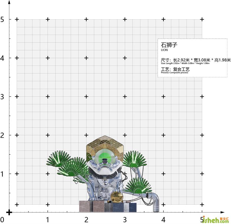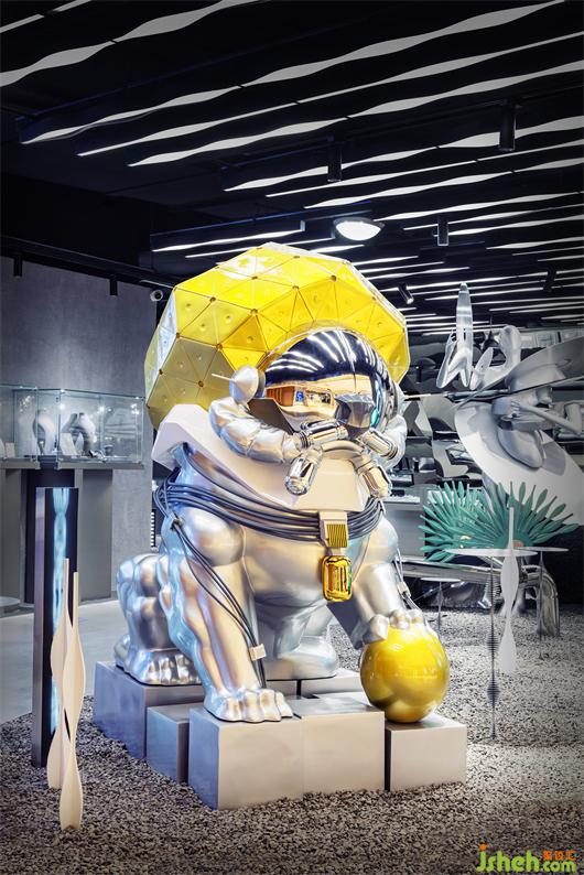 Thehead of installation isshaped as armor; the face is a mirror reflection sphere with electroplating process and combined with the technical "facial features" by metal component tube, airbag, antenna parts,and so on; the neck collar is changed to a few rounds of cable with the unique capsule ring box ofthe brand and extends to the pine branches behind; and the body is integrally formed by the glass fiber 3D printing process. The green pine branches behind the stone lion are made into laser type and create power efficiencyfrom the combination with the connected cable.