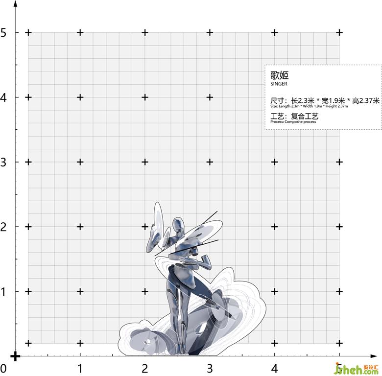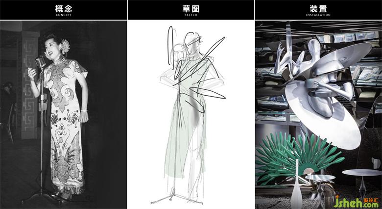 We extracted the typical images of songstress and old record, then interlace and separate the human body with the records. The songstress presents a broken image with cutting of the records as if she was about to dissipate but still maintained her performance posture which was more like an unreal image in a dream. The bright metal paint texture makes the whole installation show a sense of future science and technology. The records with mixed sizes that cross and protrude around the body represent the electronic music library of the cyber singer, also smybolize her vigorous desire of expression in this dream journey.