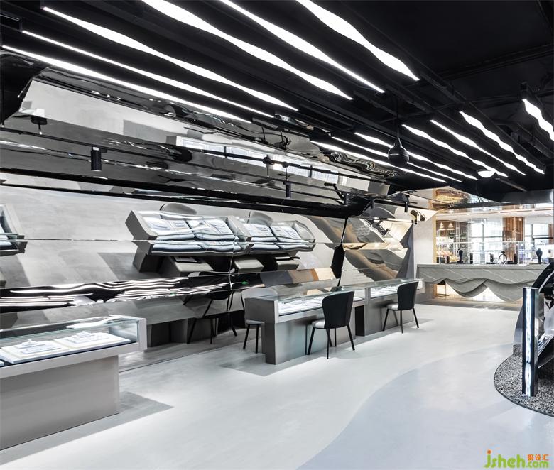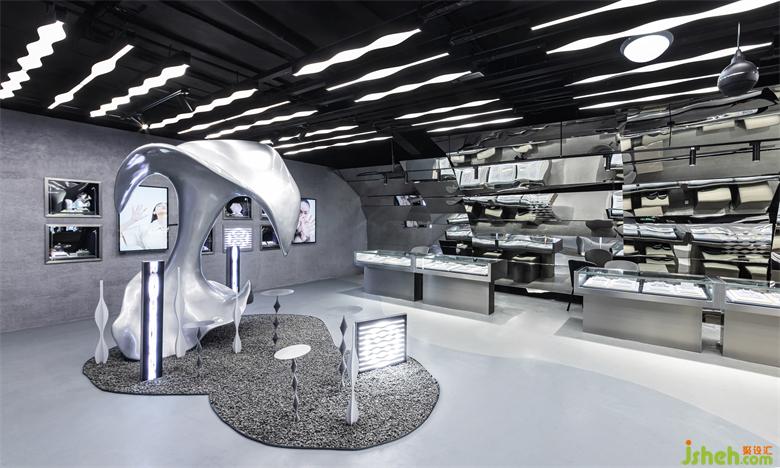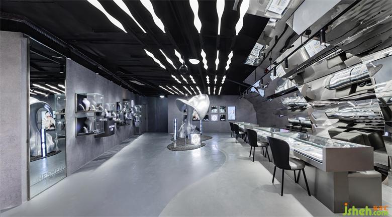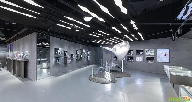 整個(gè)室內(nèi)空間的材質(zhì)都偏冷硬,與未來主義的科技感和疏離感更貼合。灰色的啞光地坪漆、仿水泥質(zhì)感的墻面肌理漆、高反射的鏡面不銹鋼,純黑色的天花板,以及閃亮的展示柜玻璃,不同材料在亮與暗、深與淺、光滑與粗糙的對(duì)比中碰撞、結(jié)合,最后和諧的融為一體。而櫥窗展柜支架、室內(nèi)地坪漆與藝術(shù)裝置的分區(qū)都使用了曲線元素來軟化空間和裝置大面積使用金屬和灰色所帶來的冷硬感,也拉近人與空間的距離,對(duì)客人更顯親切。