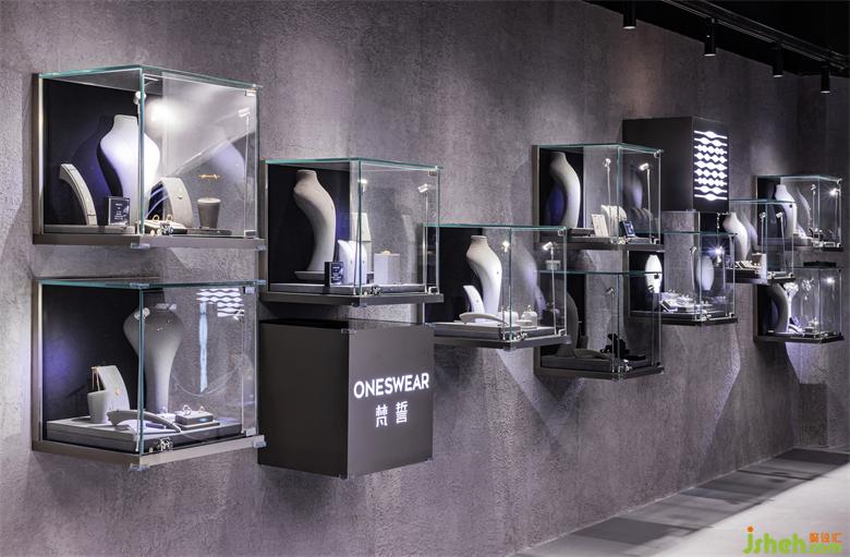 ▼錯(cuò)落的掛墻展柜與品牌logo, Display cabinets and brand logoare scattered on the wall