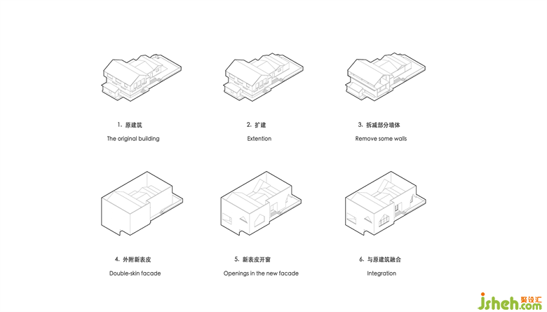 Adopting this approach, on the one hand, the newly built external facade structure is separated from the original structure to ensure the safety of the structure; On the other hand, different from the conventional, the use of house-shaped windowing forms to continue the sloping roof elements and add interest to the building.