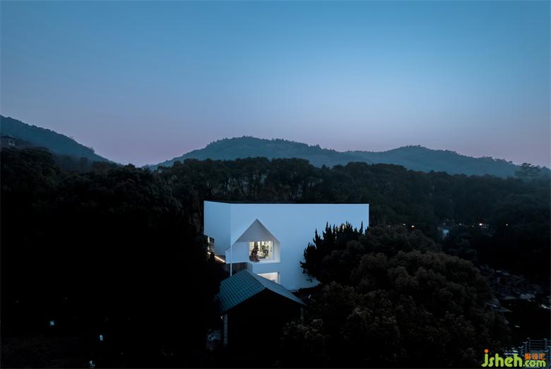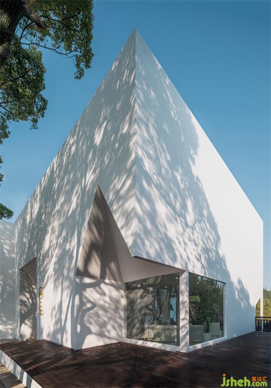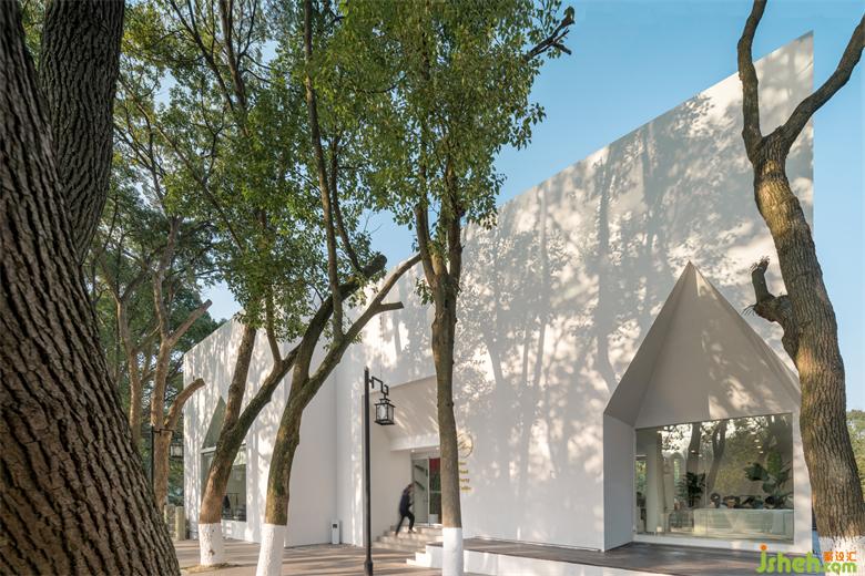 白色、純凈的立面投射出棧道兩側(cè)斑駁婆娑的樹影,整棟建筑與自然融為一體。