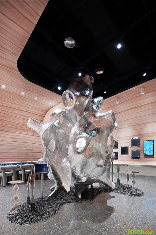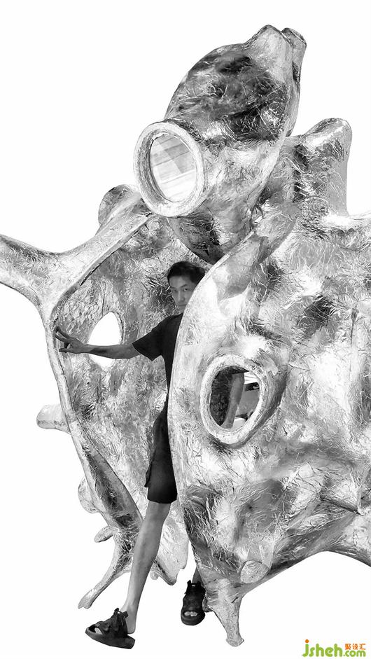 裝置整體采用玻璃纖維3D打印工藝,使用鋁箔紙?jiān)诒砻孀龀鲴薨櫟募±恚仁菍?duì)心臟纖維的意象表達(dá),也營(yíng)造出時(shí)尚先鋒的金屬質(zhì)感,打造藝術(shù)外形的同時(shí)又體現(xiàn)著理性與克制的美感。