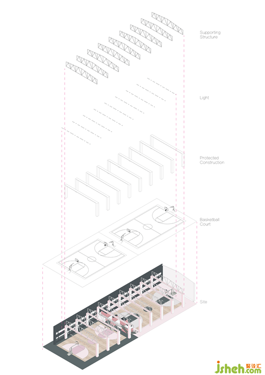 這個(gè)廢棄場(chǎng)地的吊頂結(jié)構(gòu)建立在一體化的鋼筋混凝土樓板上,籃球館設(shè)計(jì)預(yù)制的鋼筋混凝土立柱構(gòu)成了垂直方向的支撐結(jié)構(gòu)。屋頂處的桁架采用了統(tǒng)一噴黑處理,一跨度達(dá)到6米,在立柱之間以不同灰度的的隔音墻板填充,立柱也運(yùn)用了吸聲防撞粉色軟包與吊頂連接為一體。