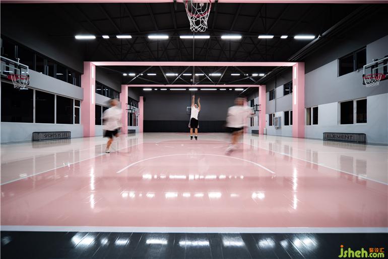 ▼室內(nèi)采用黑色與粉色,配合橡木質(zhì)地板等,創(chuàng)造一個(gè)有層次的空間,basketball court, using the neutral color tones, oak floor system to create an interior space with simple and elegant spatial layers © Yixiang Wang
