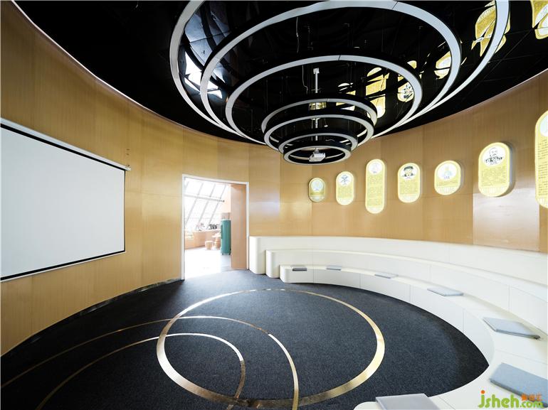 圓形的聲創(chuàng)小劇場整體設計風格也與展廳相近,漣漪的形態(tài)覆蓋整個空間,形成可容納多人的階梯,書屋設計用于后期作為喜馬拉雅系列IP分享活動時作為來賓們的互動交流區(qū)。地面上的圓環(huán)仿佛象征著演講者與聽眾之間思想的電波碰撞,在劇場內(nèi)激起層層漣漪。屋頂?shù)臒麸椗c此相呼應,不銹鋼頂面仿佛水面,倒映著整個劇場。小劇場外部分割出一個小型直播空間,以玻璃隔間的形式鑲嵌在流動的墻面中,隔絕外部聲音,滿足對直播活動的需求。