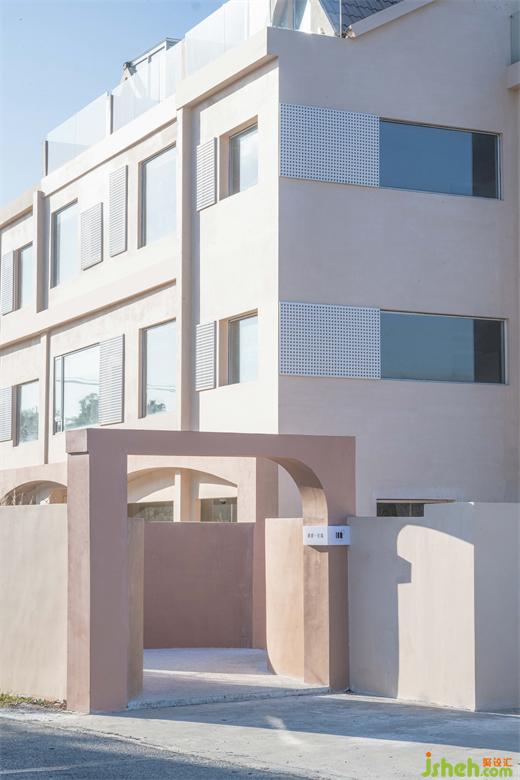 光之于空間,猶如空氣之于生命,我們花溪民宿改造設(shè)計(jì)格外重視光影的營(yíng)造。在整修室外空間時(shí),首先對(duì)門(mén)窗進(jìn)行重裝,考慮到造價(jià)問(wèn)題,我們沒(méi)有對(duì)建筑外立面進(jìn)行大的修改,只是做了拆除與粉刷,用大面積的粉色確立起整間民宿的視覺(jué)特征。在挑選外立面裝飾時(shí),十分注重“自然采光”的原則,用穿孔板形成塊狀感,巧妙地利用自然光線突出室內(nèi)環(huán)境的層次,營(yíng)造出斑駁陸離、明暗有致的視覺(jué)效果。