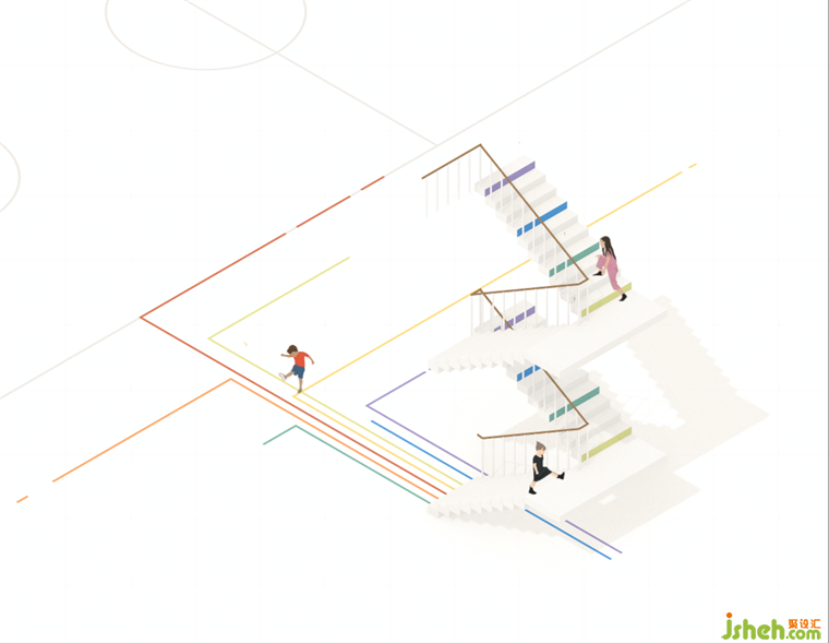 學(xué)校樓梯聯(lián)系著樓層與樓層和操場,是重要的空間的延申。原本設(shè)計(jì)中,小學(xué)改造將這部分設(shè)計(jì)為了七彩樓梯與操場,希望給孩子們帶來顏色的視覺刺激與享受,創(chuàng)造更多有趣的空間??上У氖怯捎谠靸r(jià)有限,這部分的設(shè)計(jì)并未實(shí)現(xiàn)。