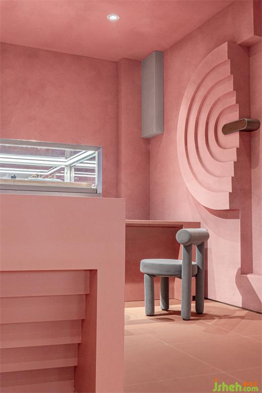The design abandons the formulaic design ways of traditional jewelry stores, it does not pursue gorgeous decoration such as precious stones, wood grains, and metal edges in, but uses mottled light pink texture paint to find an emotional balance between simplicity, roughness, and gentleness.