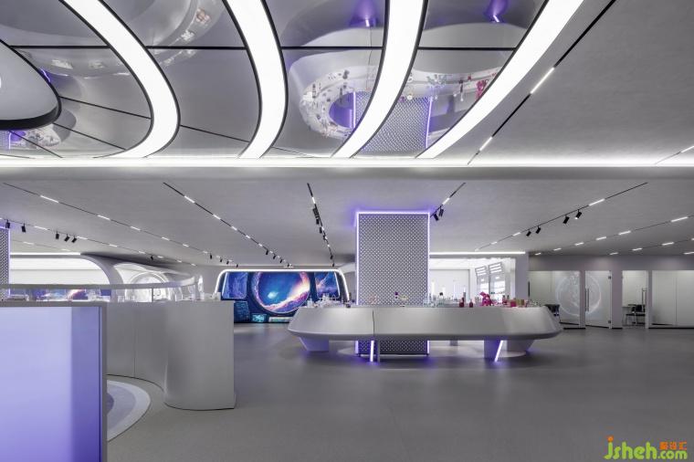 “天地玄黃,宇宙洪荒,日月盈昃,辰宿列張?!保藗儚墓胖两?,從未停止過對宇宙時空的探索,宇宙的未知性與神秘性使得它成為了人們對未來的探索路徑之一。展示著廣袤無垠宇宙的巨大顯示屏,白紫相間的線性燈帶猶如跳動著的不規(guī)則星系將旅客們從打開電梯門的一刻瞬間便拉入到未來時空的旅途當(dāng)中。在安特未來靈感艙來一場穿越星際的未來探索,融入全新的科技元素,結(jié)合化妝品展廳打造了一個沉浸式未來風(fēng)格的感官盛宴。