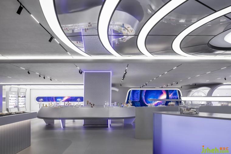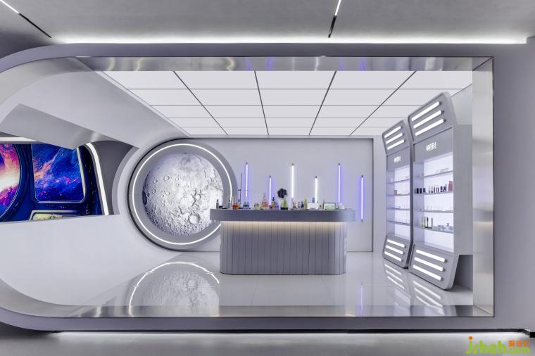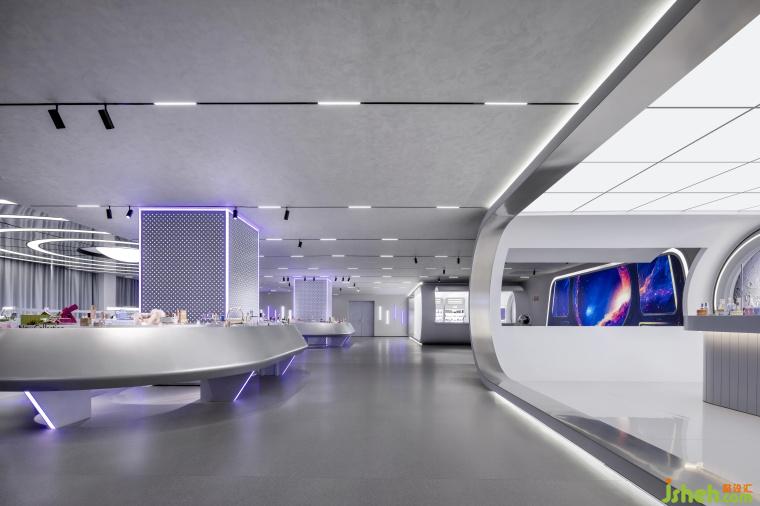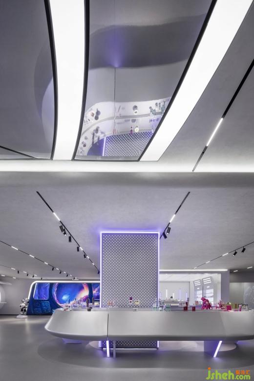 在燈光營(yíng)造方面,巨大顯示屏展示廣袤宇宙,配合白紫相間的線性燈帶,像跳動(dòng)的星系,瞬間將人帶入未來(lái)時(shí)空;“太空艙體驗(yàn)區(qū)” 的環(huán)形燈帶搭配銀灰色金屬材料,LED燈如璀璨星河,增添夢(mèng)幻感??臻g構(gòu)建上,化妝實(shí)驗(yàn)艙的弧形設(shè)計(jì)搭配網(wǎng)格拉膜天花,模擬太空艙環(huán)境;實(shí)驗(yàn)艙的觀察窗,透出的真實(shí)世界與宇宙奇觀形成對(duì)比,增加空間層次,以往商品陳列區(qū)的傳送帶元素模擬物資運(yùn)輸,兼具功能與科技感。