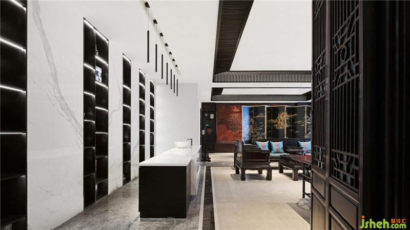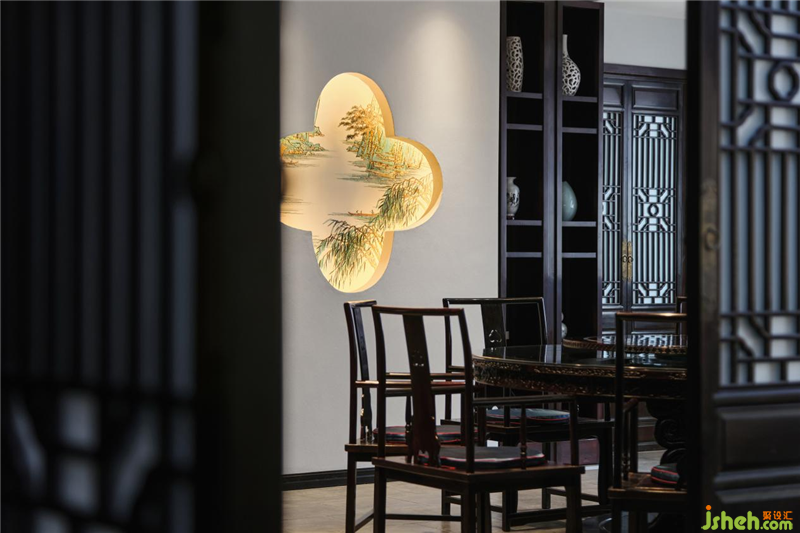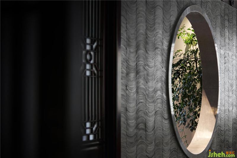 二進(jìn)營造吃飯喝茶的餐食區(qū)域,設(shè)計了圓桌,這是傳統(tǒng)中國人就餐的方式,配備暗門的廚房。南京會所設(shè)計上與第一進(jìn)和第三進(jìn)相連,所有圍合的花格門皆可打開,閉而不合,不豎實墻。