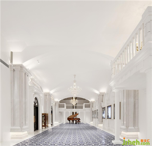 青花瓷與歐洲是有著悠久的歷史淵源的,作為元代橫空出世的曠世瓷器,本身它就是一件完美的中西方融合的產(chǎn)物,元人西征,南京展廳設(shè)計(jì)用中國瓷器的制造工藝,及中歐特有的蘇麻尼青料,創(chuàng)造了青花瓷特有的藍(lán)色,所以自此青花在而后的明清時(shí)期不僅成為歷代達(dá)官貴族追捧的收藏件,同時(shí)又通過古絲綢之路成為了歐洲的寵兒,在歐洲古典繪畫中常會出現(xiàn)青花瓷的身影,所以色調(diào)上整個(gè)藝術(shù)廊把青花的蘇麻離青料特有的青灰色地磚作為地面,而這也成為了空間中唯一硬裝基礎(chǔ)上可見的顏色。