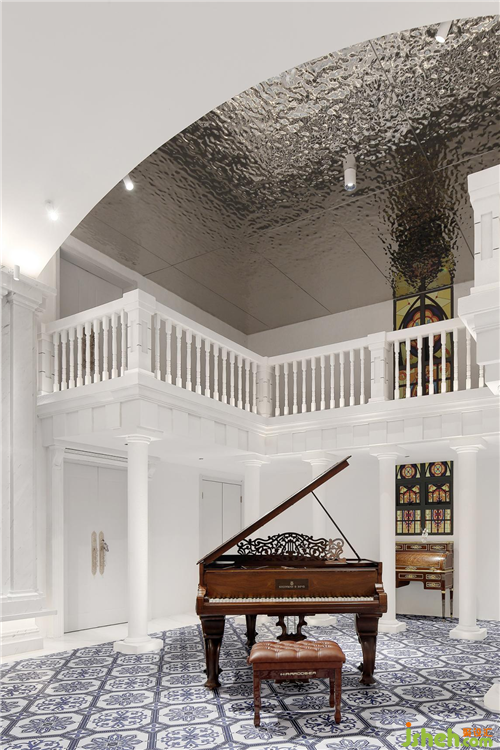 不銹鋼是相對現(xiàn)代風(fēng)格中常用的一種材質(zhì),在藝術(shù)廊中,我們用這個(gè)材質(zhì)最主要的原因是這個(gè)廊橋的下部會有一架正好生產(chǎn)于1865年的“施坦威”古董鋼琴,不銹鋼的鏡面反射效果,會讓這部鋼琴在頂部有一定投射,同時(shí)水波紋的肌理,會讓這種投射變得相對模糊,也就是廊橋上的人、廊橋下的琴、與頂部映射的影像,三者之間會相對形成空間中比較有趣味性的畫面。