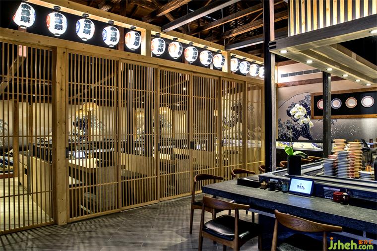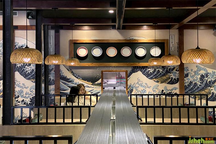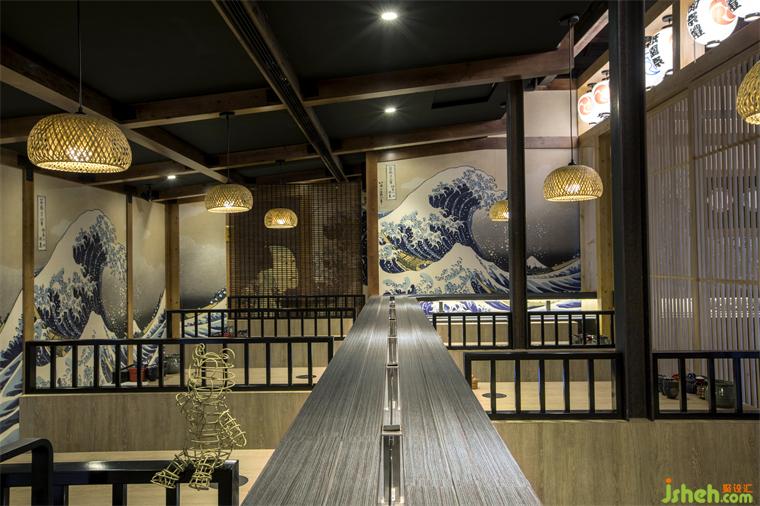 餐廳設(shè)計為強(qiáng)調(diào)『侍悟丸回轉(zhuǎn)壽司』日式料理的文化背景及食材的鮮美。整體空間以入日本最具代表性的浮世繪貫穿全場,重現(xiàn)出江戶時代的繁華,大器又華麗,更讓人猶如置身大海中享用最鮮甜的食材。