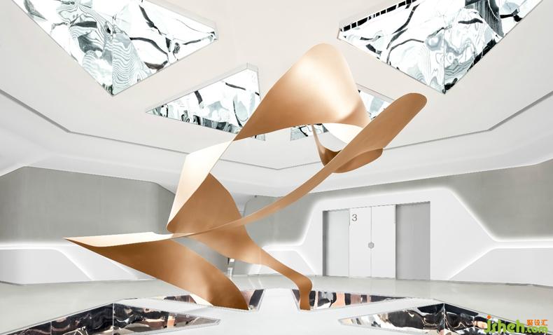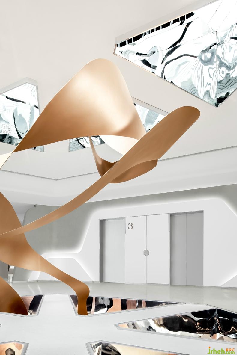每個(gè)三角形的中空結(jié)構(gòu)的內(nèi)壁都是鏡面不銹鋼,形成一個(gè)空間萬花筒,通過光影的折射,畫卷、天空、室內(nèi)環(huán)境,共同形成了一個(gè)變化豐富的視覺亮點(diǎn)。