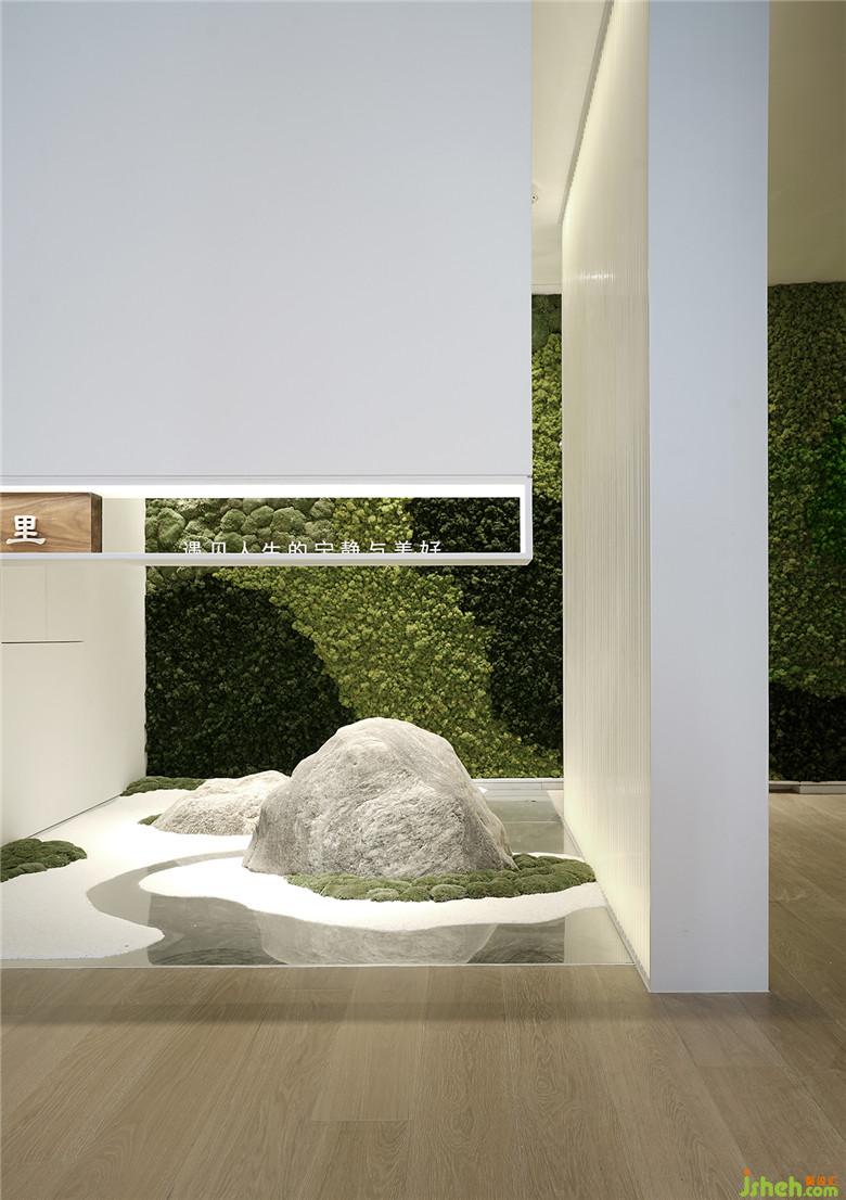 山重水復(fù)疑無路,柳暗花明又一村??此瓶臻g到了盡頭,而展廳側(cè)墻出口則又進(jìn)入了另外一個空間——vip接待室。獨(dú)立的設(shè)計相當(dāng)注重人的隱私,橫向大面的玻璃窗,計劃性地將窗外墻內(nèi)的自然園景吸納入內(nèi),讓室內(nèi)之人面外視窗最美的部分,氣氛安全隱秘而又無比舒適。