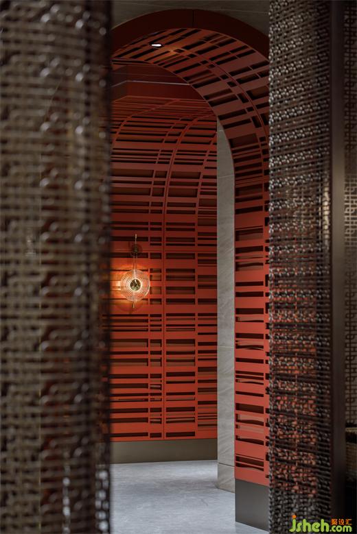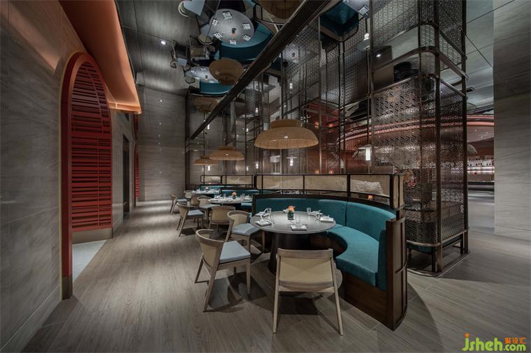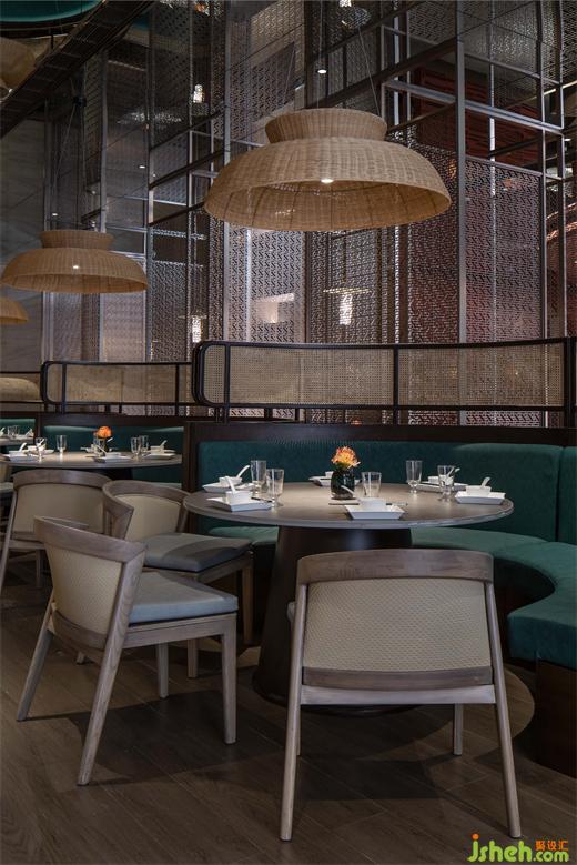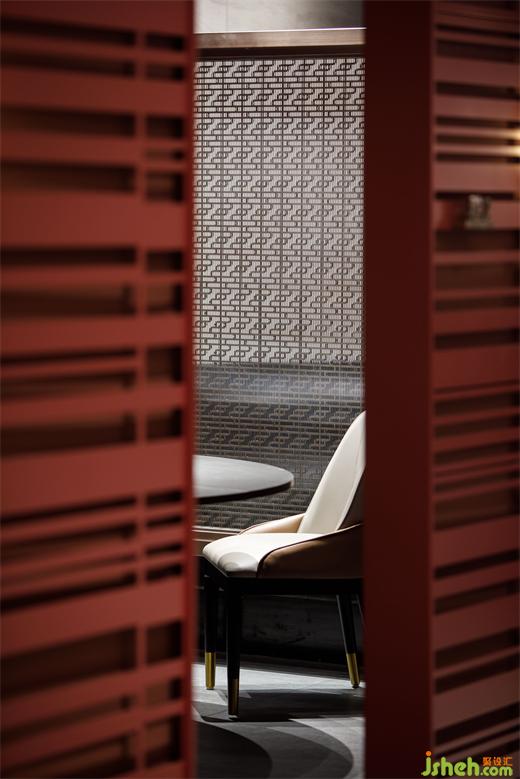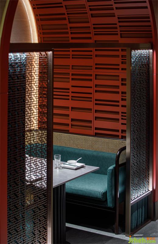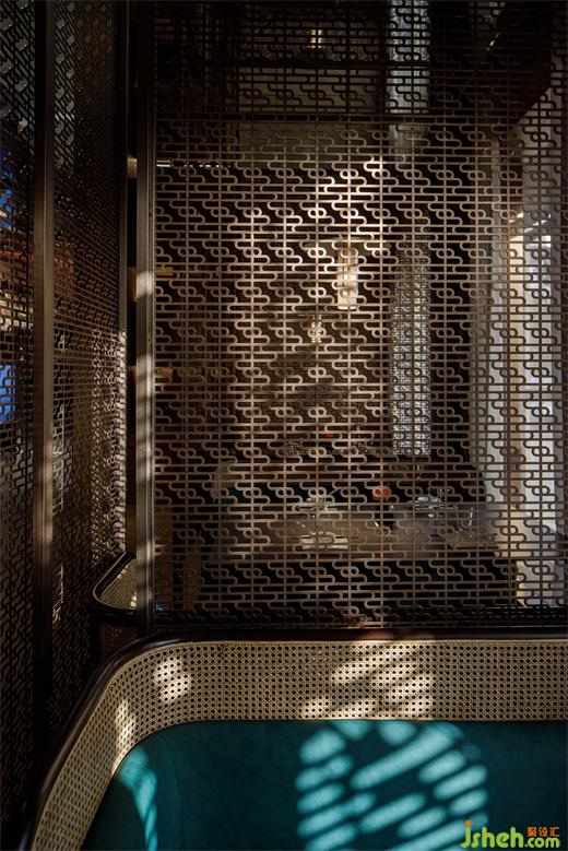古銅色金屬格柵是從南泥灣logo的演變而來,餐廳設(shè)計提高了空間質(zhì)感的同時解決了散座區(qū)賓客的隱私問題,陽光穿過格柵,極具中國意境美。