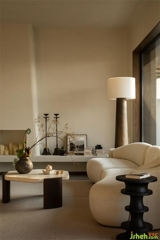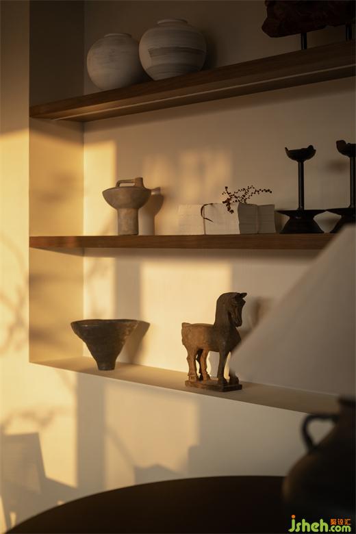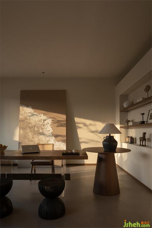 歷史留下沉積,陽光永恒不變。得益于光影的配合,風景也跟隨人的腳步向室內(nèi)延展,生發(fā)令人心生向往的松弛感。一張隨性的長桌茶臺、具有生活包漿感的老木件、落地斜倚的大畫,是空間慵懶的自語。民宿設(shè)計師特意在一層主樓建筑上方增加了長長的格柵屋檐,一直貫通到餐廳連廊,既可遮風擋雨,又能徜徉在自然的風中。拿個蒲團落坐于此,發(fā)呆,看書,聊天,坐看光影在墻面、地上攀爬嬉戲,山里的風吹過門廊,格外輕松。