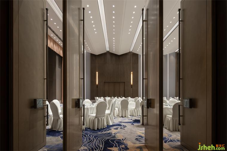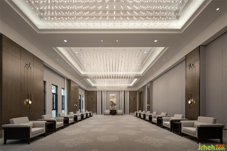 第二個(gè)體塊則是利用原有建筑空地新增的功能區(qū),用于會(huì)議接待,包含一個(gè)可容納440人的多功能廳、1個(gè)會(huì)議室、2個(gè)接待室以及帶有地域文化符號(hào)的多功能包間,整個(gè)空間莊嚴(yán)典雅,適合政務(wù)接待等多種活動(dòng)需求。設(shè)計(jì)師還在此空間內(nèi)增設(shè)了兩個(gè)小庭院,疏密得益、眼前有景,賓館設(shè)計(jì)從而打破大體量空間所帶來(lái)的沉悶感。兩個(gè)體塊因四個(gè)庭院起承轉(zhuǎn)合形成回廊得以串聯(lián),實(shí)現(xiàn)了內(nèi)部空間的有序性。