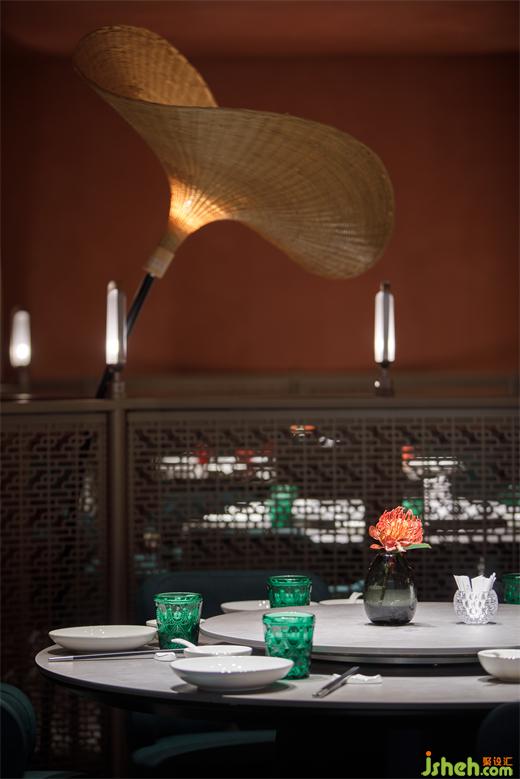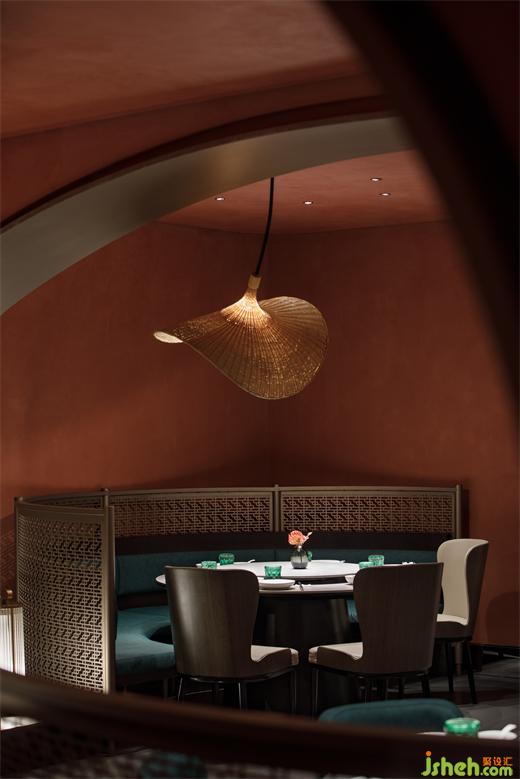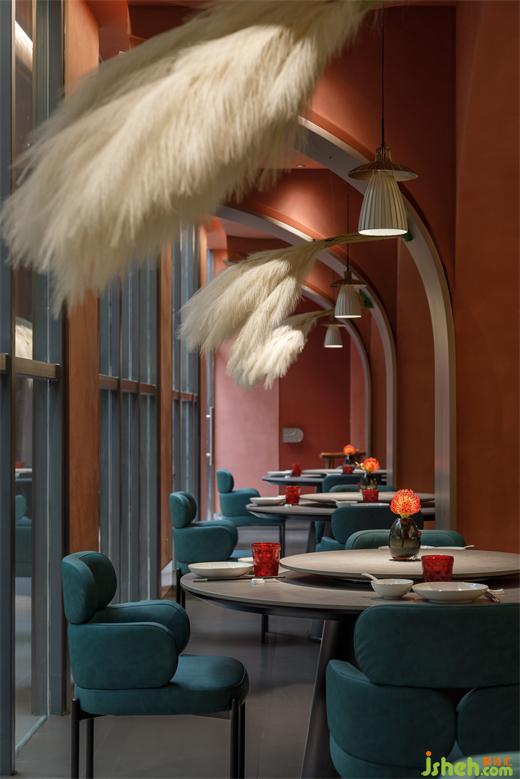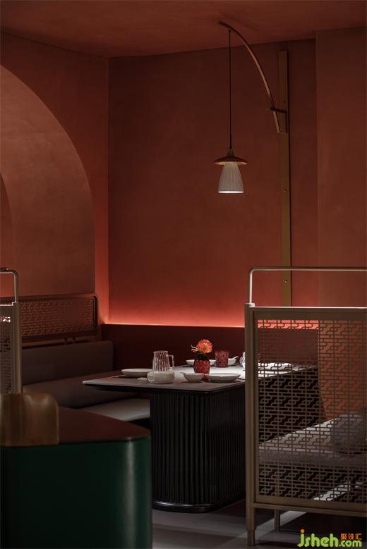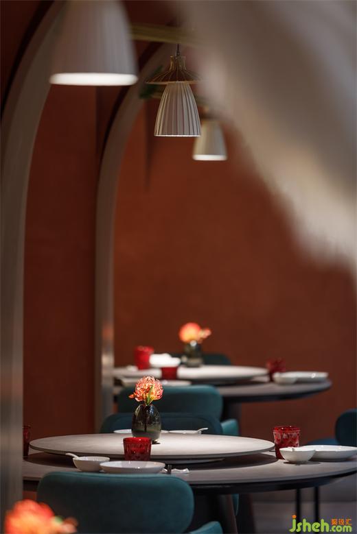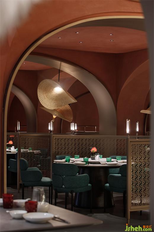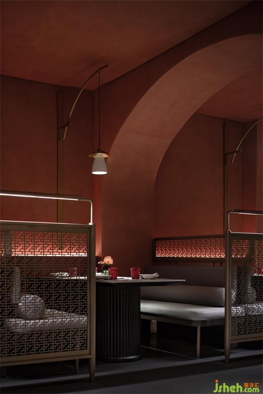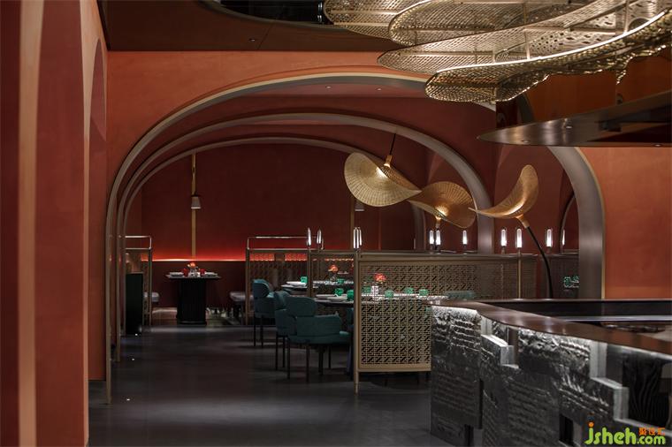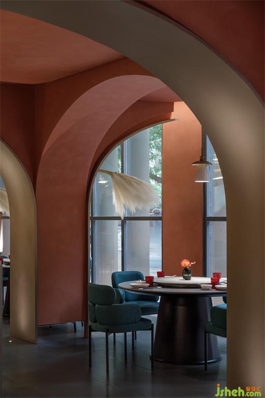 從建筑外部延展至一層空間,連續(xù)的拱形元素將西北傳統(tǒng)的窯洞建筑風(fēng)貌置入其中,通過(guò)巧妙地排列疊加化解了原空間眾多柱子產(chǎn)生的壓迫感,在燈光的烘托下弧線造型更為圓潤(rùn)柔和,形成輕松愜意的就餐氛圍。