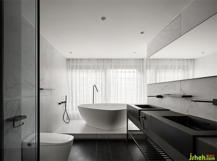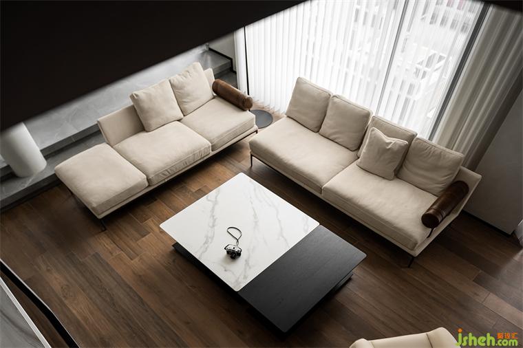 紅色的旋梯,藍色的涂料,米黃色的家具,黑白的茶幾,線性的黑色鐵藝燈具,白色的乳膠……以蒙德里安的手法編織的物象之網(wǎng),是用極簡的方式向藝術致敬。