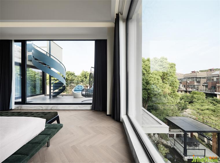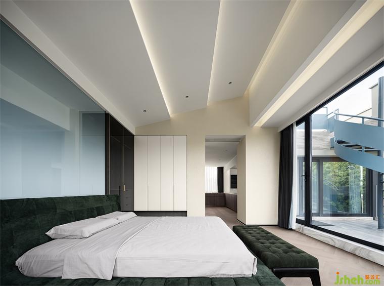 主臥被設(shè)計成一個視野絕佳之處,沒有樓宇遮蔽和線路織網(wǎng),只有星沉碧落和朗月清風(fēng)。心寧入水時,即可視天地為衾枕,攬云月入懷中。