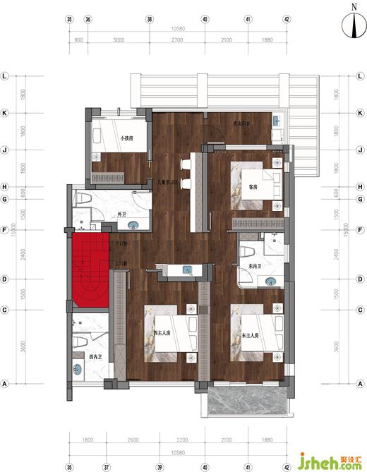 三樓是留給兒子的婚房,別墅裝飾設(shè)計師將一整層設(shè)計成一個「總統(tǒng)套房」,配套獨立的露臺、起居室、衛(wèi)生間、衣帽間和書房,基本滿足日常起居、居家辦公、私密社交等功能需求。
