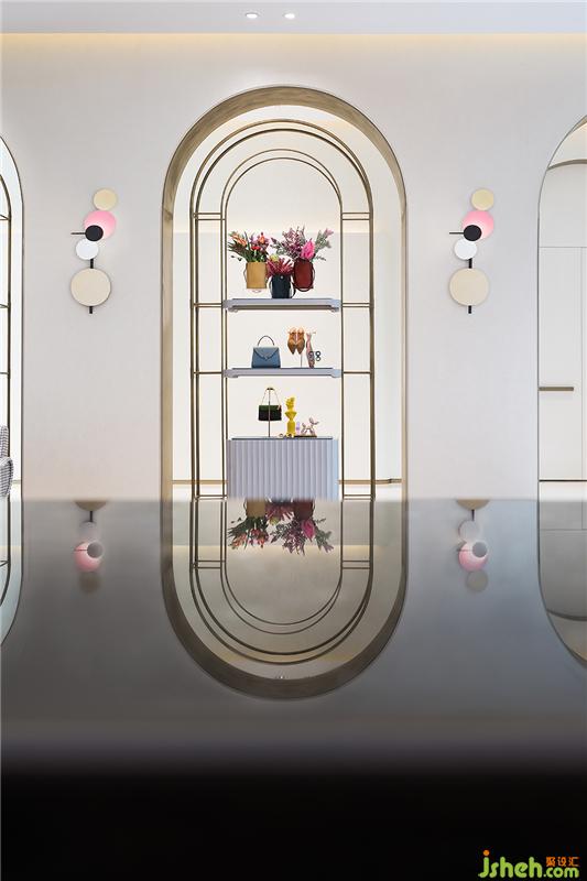 移步深度洽談區(qū),這種購物導向的參與感取代傳統(tǒng)的“單向傳播”,了解消費者的內(nèi)心與感受,進行了一場深入內(nèi)心的對話。取自于甪直地源文化中的暖白成為空間主調,在此基礎上糅和臟粉、金色和青灰色,更具有靚麗女性色彩的空間性格一覽無余。