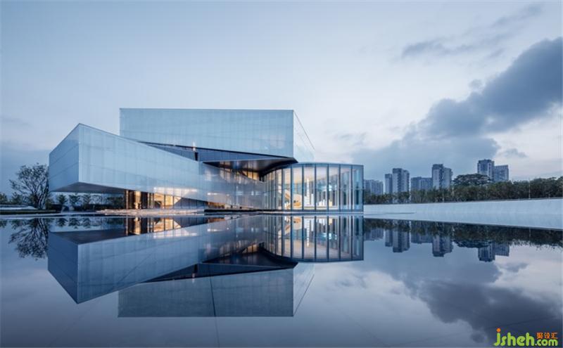展示中心以懸浮于城市上空的山水舞臺,展開的畫卷、光影的立軸,構(gòu)成的一種形而上的空間界面,而山水舞臺強調(diào)以現(xiàn)代的材料和技術(shù)手法,將中國傳統(tǒng)的文化、自然山水入畫,由畫入境,宛若人在畫中游。